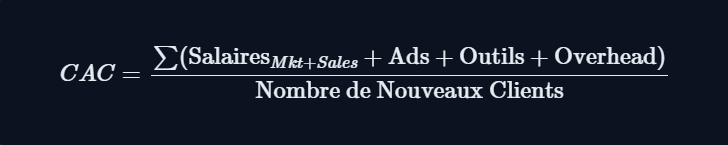 Il mesure le coût total pour acquérir un client. Il doit inclure les salaires marketing et vente, les dépenses médias, les outils (SaaS), et une allocation d’overhead (loyers, administratif) au prorata du temps passé par les équipes à acquérir de nouveaux comptes.