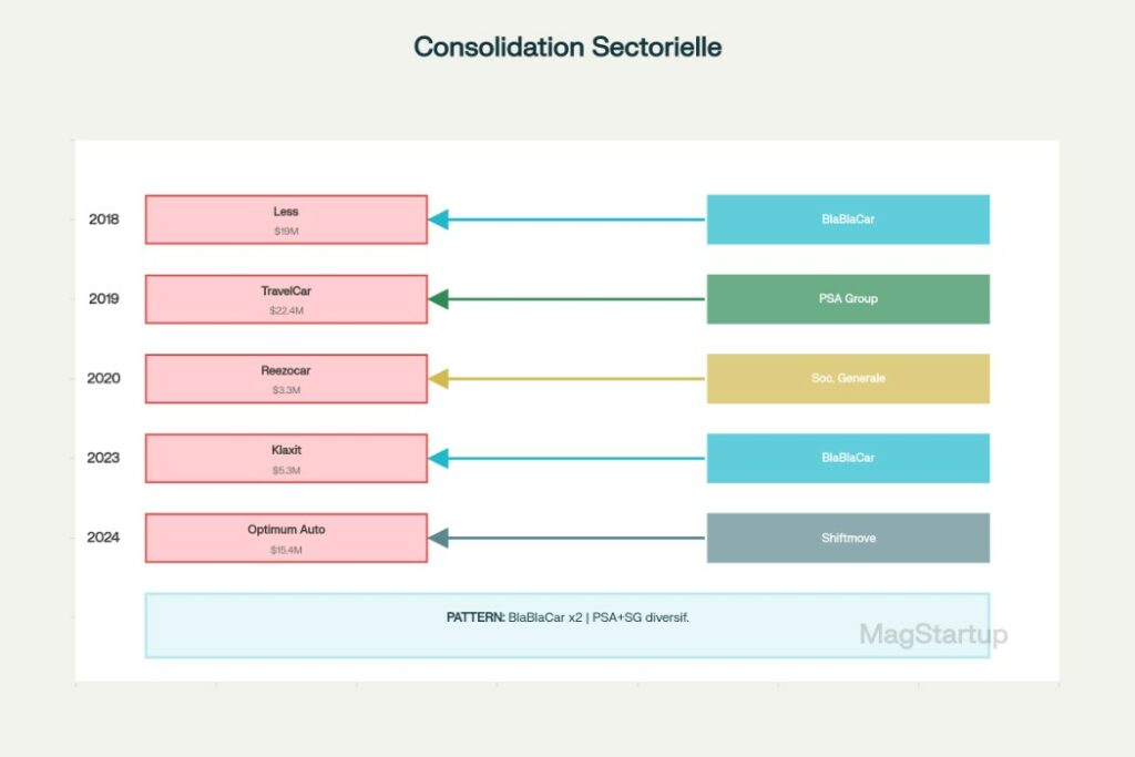 Pattern détecté : BlaBlaCar rachète la concurrence pour éliminer menaces (Less, Klaxit). PSA et Société Générale achètent pour diversifier hors automobile traditionnelle. Aucune startup indépendante n’a survécu dans le ride-hailing B2C.