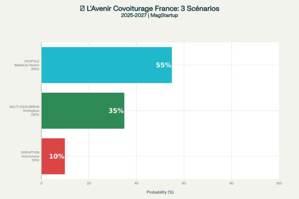 Impact : écosystème mature fragmenté, chaque acteur défend sa niche, aucun ne devient géant global. Ce scénario suppose que Heetch trouve financement (Series C 40-60M$) pour tenir 3-5 ans, et que Karos atteigne rentabilité sur segment corporate (estimation : 50M€ revenues annuels nécessaires). Données sectorielles suggèrent croissance corporate +263% pourrait soutenir trois acteurs B2B distincts si différenciation géographique maintenue.