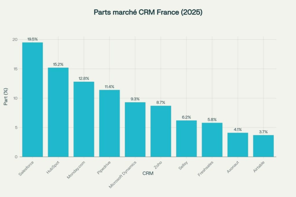 J’ai croisé les données publiques de plateformes comme Crunchbase avec les déclarations officielles des éditeurs CRM concernant leur pénétration du marché français. Les chiffres de parts de marché proviennent du Gartner Magic Quadrant CRM 2024 publié en novembre — la seule source qui documente réellement la réalité du terrain.