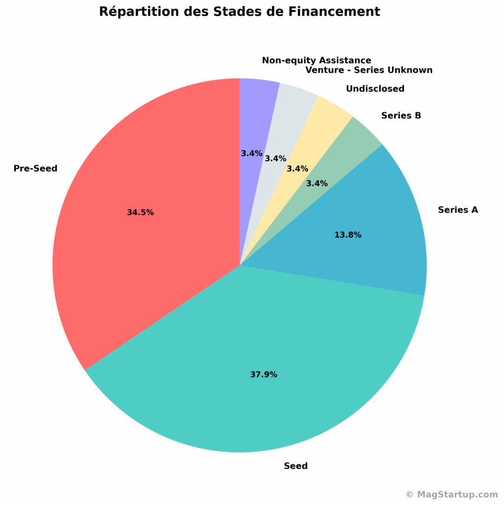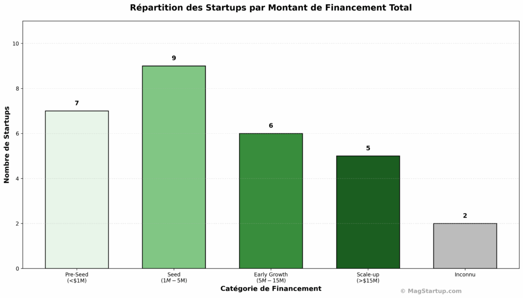 Le financement médian est de 3,5 millions de dollars, ce qui situe la majorité des startups dans la zone « Seed to Early Growth ». Neuf startups (31%) ont levé entre 1 et 5 millions, un montant suffisant pour construire un MVP et acquérir les premiers clients. Mais insuffisant pour scaler à l’international. La transition Seed vers Series A reste le goulot d’étranglement critique : le ticket moyen des rounds Series A en Europe est passé de 15M$ en 2021 à 8M$ en 2023.