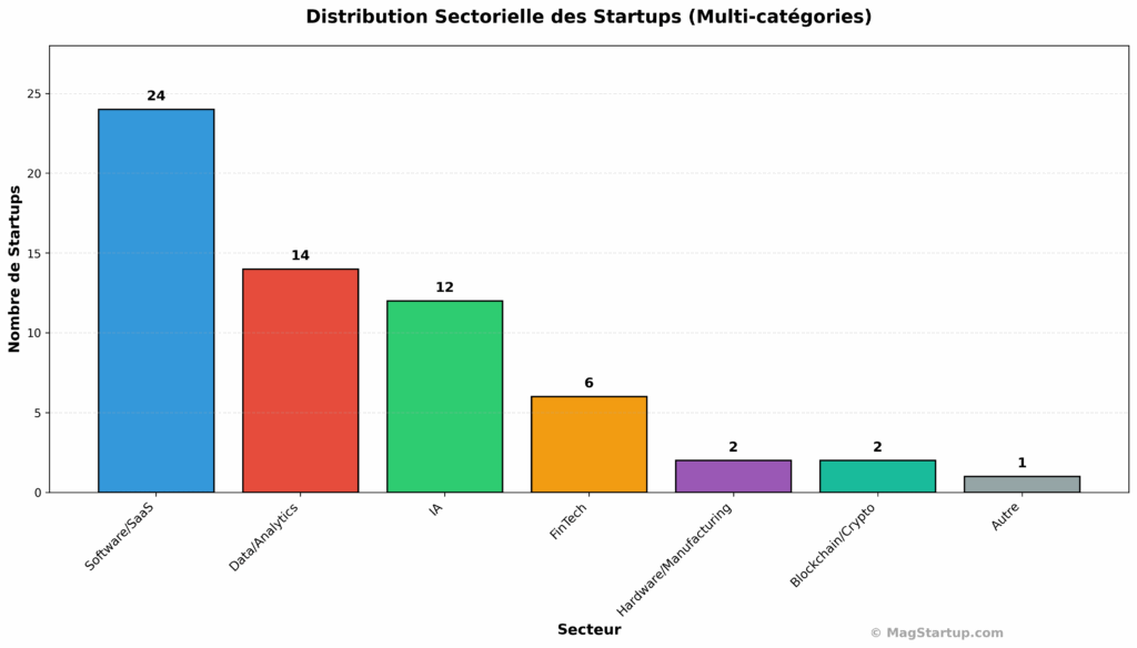 Cette concentration géographique s’accompagne d’une concentration sectorielle tout aussi brutale. Y Combinator n’investit pas au hasard. L’analyse révèle une stratégie ultra-ciblée : 83% sont dans le Software/SaaS, 41% dans l’IA, 21% dans la FinTech. Ces trois catégories—souvent combinées dans une même startup—représentent le cœur de l’appétit YC pour les business models scalables et les marges élevées.